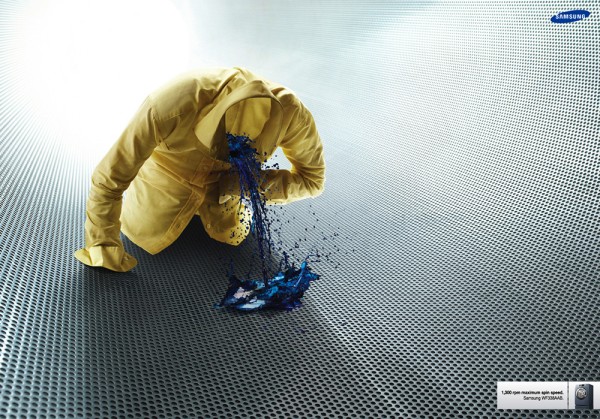 超现实风格的广告场景:一件没有身体的黄色衬衫跪在金属打孔地面上,呕吐出鲜艳的蓝色液体。液体飞溅动态感强,象征洗衣机的超强甩干能力(1300rpm)。背景干净现代,有强烈的聚光灯照射,整体视觉冲击感十足。灵感来自三星洗衣机广告。
