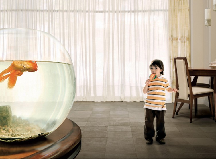 ※日本語: ユーモラスで少しシュールな室内シーン。テーブルの上の金魚鉢の中で、金魚が逆さまに浮かんでおり、死んでいるように見える。背景には、オレンジと白のボーダーシャツを着た子どもがカラフルなロリポップを手にして立っており、不思議そうに金魚を見つめている。部屋は明るく、清潔で、薄いカーテンと整ったダイニングスペースが . . .