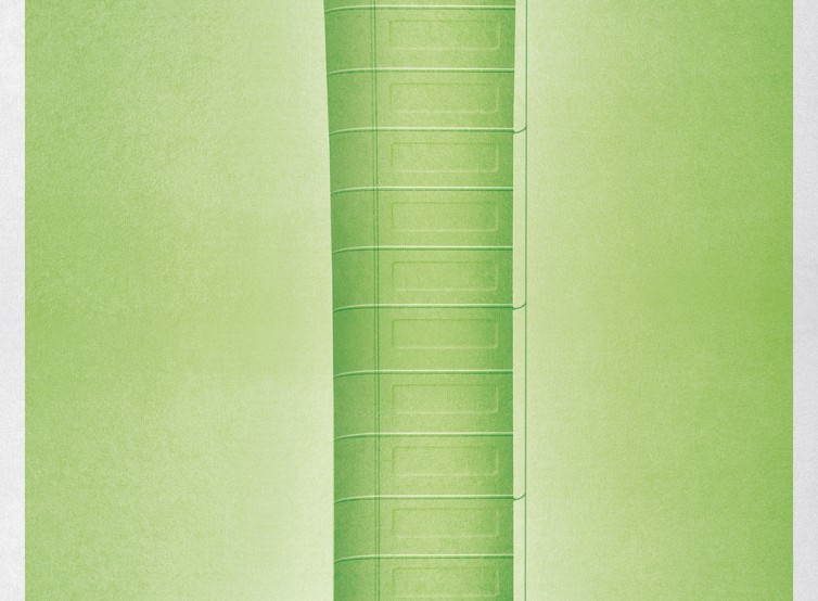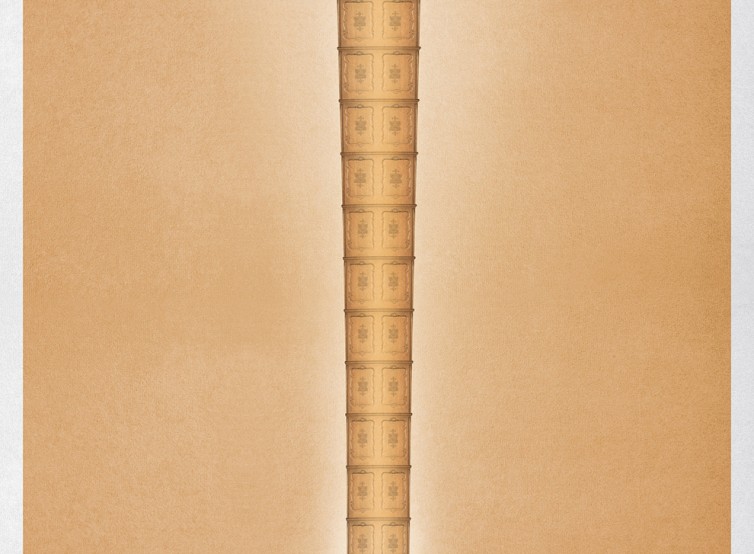 緑色の背景の中、小さな配達トラックが駐車している。そのトラックからは、巨大なファイルキャビネットのような構造物が天井に向かって伸びており、膨大な