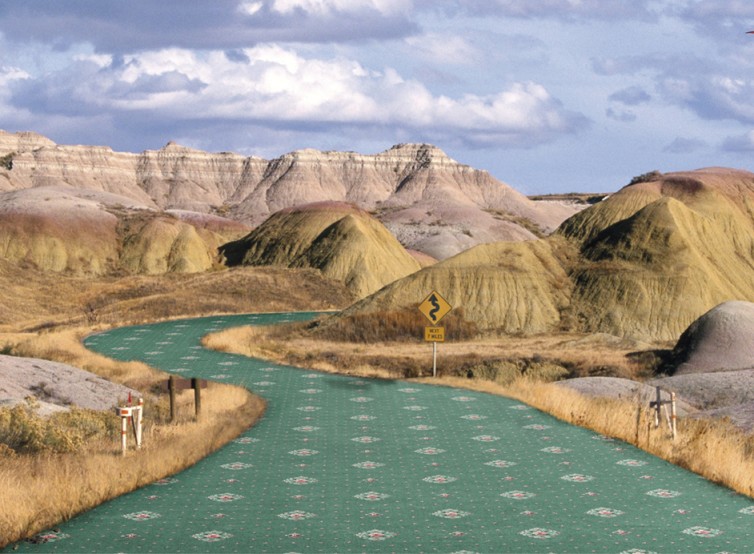 砂漠の山岳地帯にある道路が、玩具のような模様がついた緑色のカーペットに変身しているシュールな風景。空は曇りがちで柔らかい光が影を作っている。