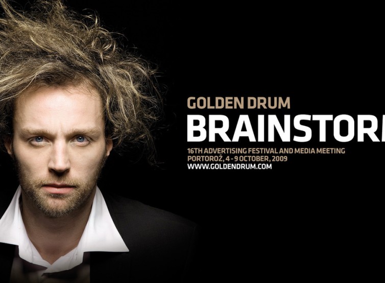ヨーロッパのクリエイティブフェスティバルのプロモーションポスター。真剣かつ情熱的な表情をした女性のクローズアップ写真の上に、カラフルで太字のタイポグラ