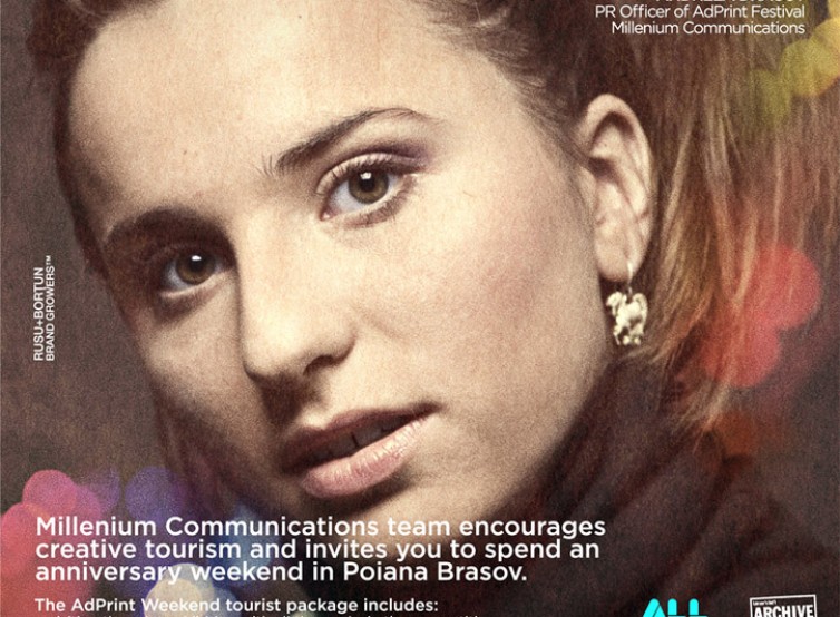 ※日本語: ヨーロッパのクリエイティブフェスティバルのプロモーションポスター。真剣かつ情熱的な表情をした女性のクローズアップ写真の上に、カラフルで太字のタイポグラフィが重ねられている。見出しは「あなたが素晴らしい週末を過ごせるよう、私は一年中働いてきました(Poiana Brasovで)」という内容。背景には暖色系の . . .