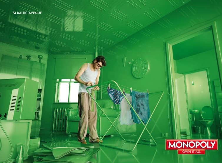 部屋の中のすべて(壁、天井、床、家具、家電製品)が光沢のある緑色で塗られている超現実的なインテリア。中央には男性が洗濯物を干しており、洗濯物だけ