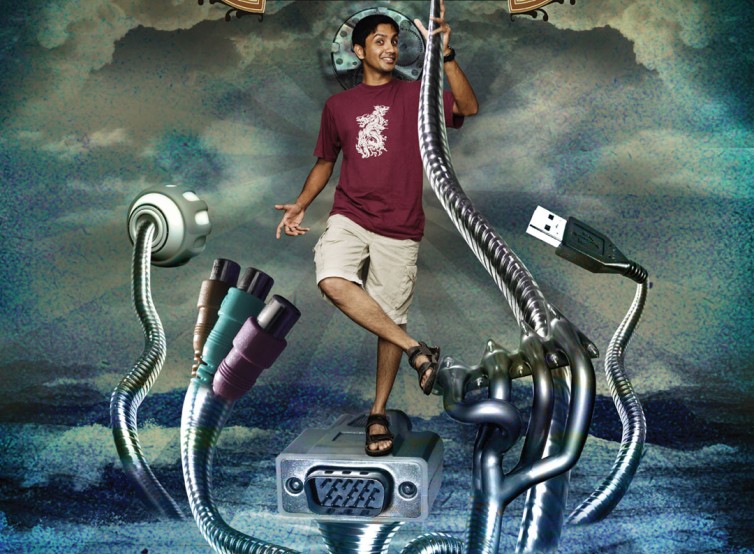 ※日本語: 巨大なVGAポートの上に立つ若者を中心に、USBやAV端子など多様なプラグで終わる柔軟なケーブルが神の触手のように彼を取り囲む、超現実的で未来的なシーン。背景は嵐のようなデジタルの海と光るテクノ雲。スチームパンクとサイバーなヒンドゥー神の美学を融合させたユーモアある表現で、ナノチューブや電気活性ポリマーに . . .