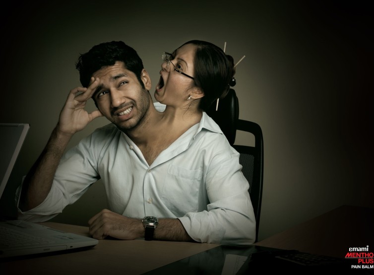 デスクに座って頭痛に苦しむ男性のシュールでユーモラスなシーン。彼の首からは、もう一つの頭部が現れ、それは彼の耳元で怒鳴っている女性の顔。