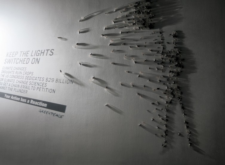 ※日本語: 壁に表現されたコンセプチュアルな環境アート作品。さまざまな角度で差し込まれた多数の電球が、人のシルエットを影で作り出している。「Keep the lights switched on」「Your action has a reaction」「Greenpeace」などのメッセージが壁に書かれている。ドラマ . . .
