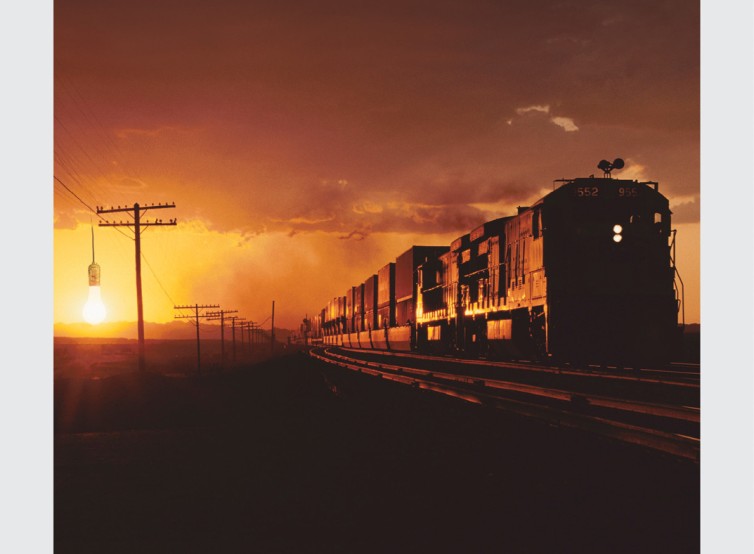 電柱から吊るされた電球が夕日そのもののように輝いている超現実的な風景。長い貨物列車がオレンジ色のドラマチックな空の下を進んでいる