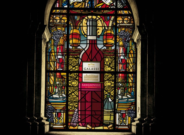 暗いゴシック様式の教会にある大きなステンドグラス。中央には後光を背負った赤ワインのボトルが聖人のように描かれている。背景には葡萄、ワイングラス、