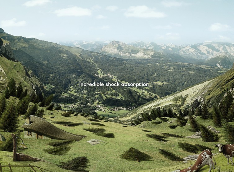 ※日本語: アルプスのような山岳地帯で、美しい草原の風景。前景には地面が波打ち、木や牛、家、フェンスなどがすべて歪んでいる。まるで激しい衝撃を受けたようだが、自転車は見えない。視覚的に「衝撃吸収性能の高さ」を示す。スローガン「Incredible shock absorption」と「kern by sunn」のロゴ . . .